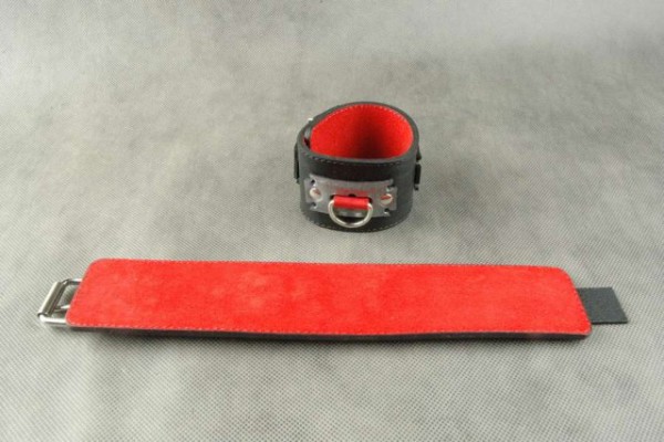 Выполнены наручники из натуральной кожи в черном цвете. Изнутри обшиты контрастным красным велюром. Декорированы наручники кожаной вставкой металлического цвета в виде лезвия, что придает особенный стиль и выглядит весьма элегантно!